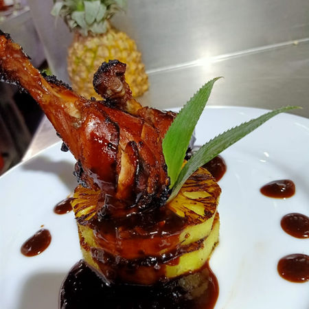 Mix ingredients 1-6 in a bowl. Keep aside ¼ of the marinade to make a sauce. Coat the chicken with the rest of the marinade and keep it in the fridge overnight (8 hrs). Remove the marinated chicken and grill on a hot griddle or BBQ Grill for 8 to 10 mins or as required. Heat the reserved marinade, pass through a fine sieve. Keep aside. Slice pineapple, remove the core and grill it, apply butter.